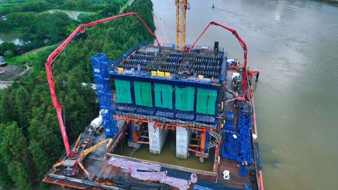 10月5日,经过29小时连续浇筑,中山东环北延线桂洲水道桥2#墩左幅0号块首次浇筑圆满完成,正式进入上部结构施工阶段。