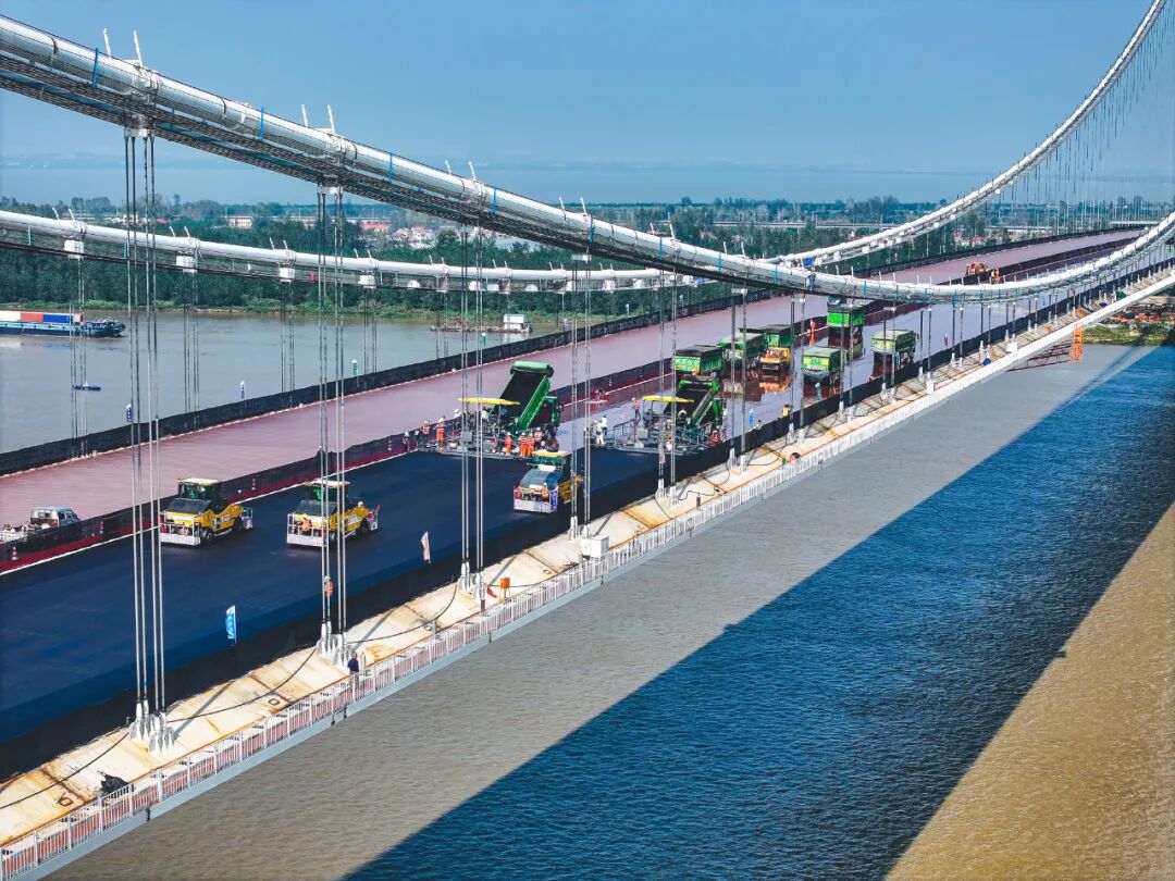 目前,双柳长江大桥主桥钢桥面铺装已全面进入冲刺阶段。项目团队凭借新设备、新工艺与新技术的综合应用,为双柳长江大桥建设提供了有力支撑,其智能建造经验更将为热拌环氧沥青铺装领域提供重要范本。