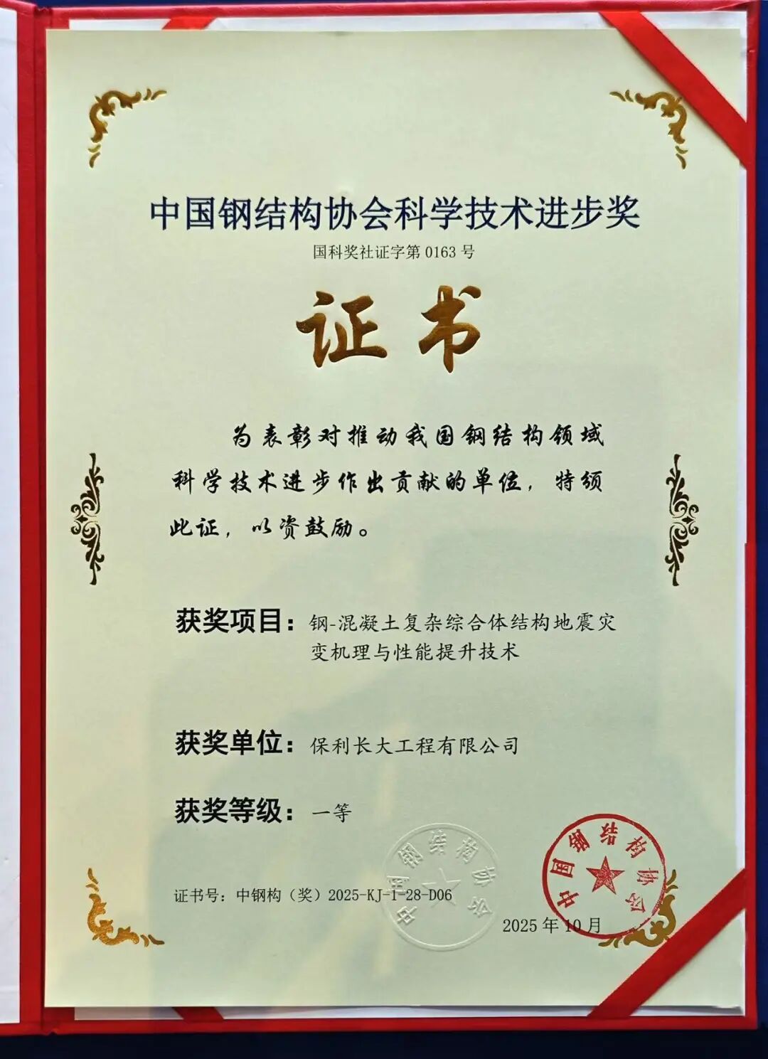 近日,中国钢结构协会2025年度科学技术进步奖结果正式公布,保利长大依托广深高速新塘立交改造工程TJ1标项目实施总结的科研成果——“钢-混凝土复杂综合体结构地震灾变机理与性能提升技术”榜上有名,荣获一等奖。