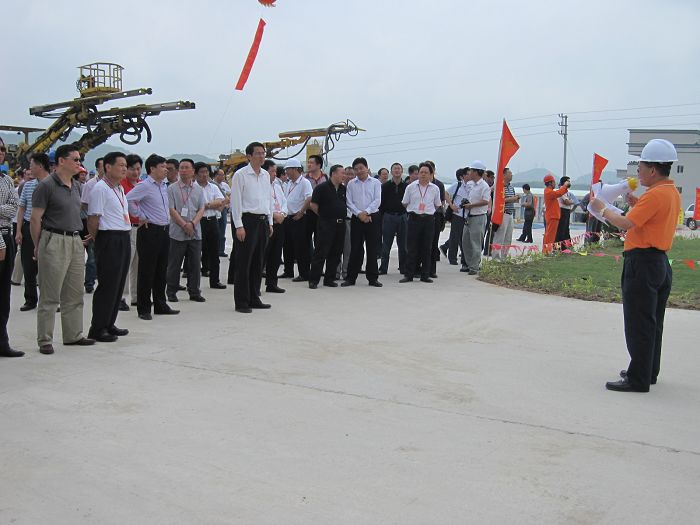 上午,参加广东省高速公路建设管理提升年活动动员会的与会人员,在交通厅何忠友厅长的带领下,一行200余人来到位于惠州新圩镇的博深五标项目部进行了现场参观考察。