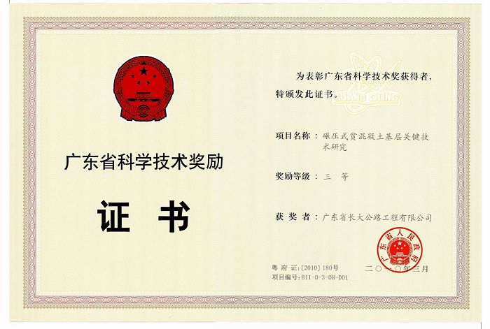 日前,广东省政府颁发了2009年度省科学技术奖的通报,公司课题《碾压式贫混凝土基层关键技术研究》荣获三等奖。该课题为2006年广东省交通集团立项课题,课题组结合京珠国道主干线粤境高速公路扩建工程,积极开展相关科研工作,并于2008年经省交通厅课题成果鉴定委员评定通过,最后申报获奖。该课题成果实用性强、推广前景广阔,成果总体达到国际先进水平。
