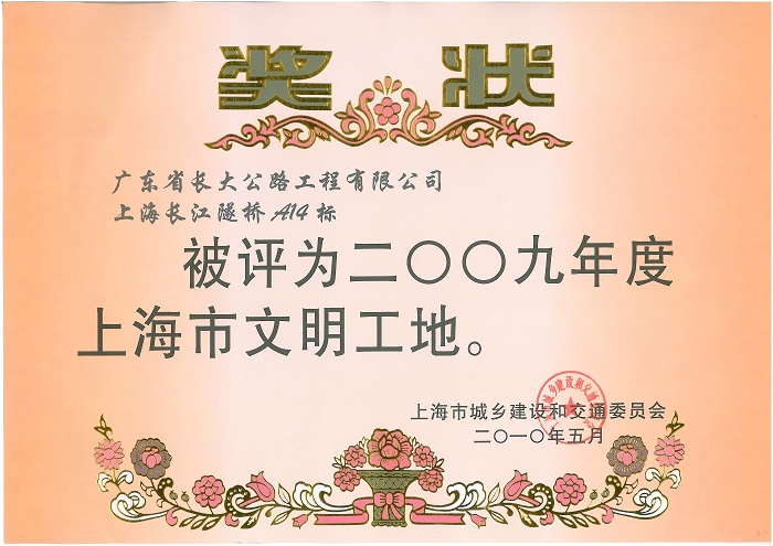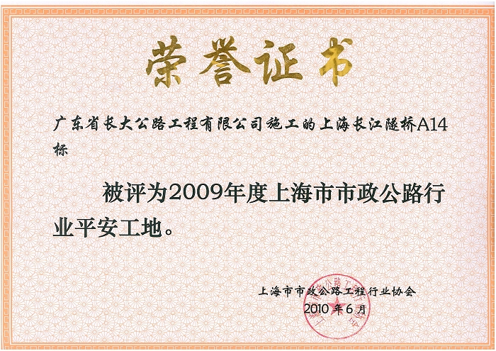 日前,公司上海长江隧桥A14标喜获上海市城乡建设和交通委员会、上海市市政公路工程行业协会授予“二00九年度上海市文明工地”及“2009年度上海市市政公路行业平安工地”的荣誉称号。之前,该项目部多次获得的上海市主管部门颁发的荣誉称号,为公司在上海市市场树立了良好的信誉度和知名度。