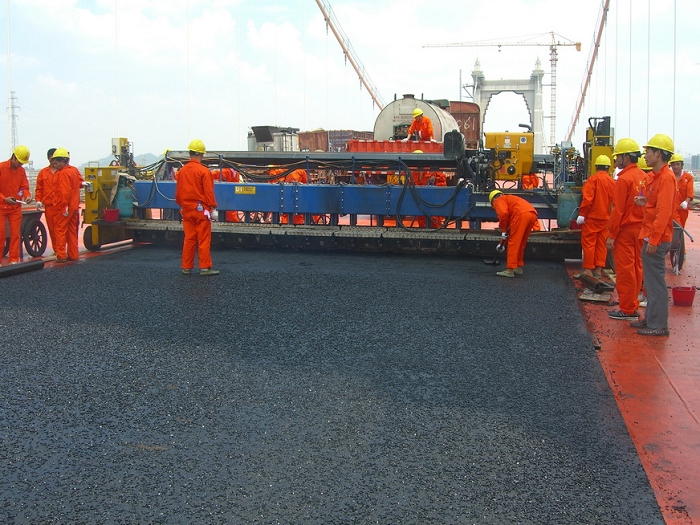 7月21日,公司承建的江西赣江大桥进入钢桥面沥青混凝土铺装施工阶段。本次钢桥面沥青混凝土铺装采用浇筑式施工,是公司在钢桥面铺装施工上首次采用的施工工艺,这将为公司在以后类似的工程施工提供技术储备、施工经验和施工业绩。
