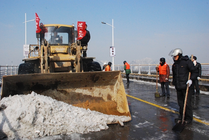 12月16日清晨,一夜风雪之后,舟山朱家尖大桥路面结满了厚厚的冰,致使车辆无法正常通行,大桥两侧滞留的车辆排起了长龙。在接到交警部门求助讯息后,项目部以最快速度抽出几十人带上工具,并调配2台铲车第一时间赶赴大桥进行破冰。冒着冷冽刺骨的寒风,大家不停地挥动着手里的铁锹、铁铲、扫把,随着边防部队和武警部队战士及大桥附近居民陆续加入到破冰队伍中,大桥上很快聚集了大约300人,在军民齐心协力努力下,仅2个小时3公里的桥面积雪、冰层全部清理完毕,大桥恢复通车。