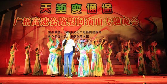 当激昂的歌声《天路》萦绕耳旁,让人们不禁想起广东省委副书记、省长黄华华同志视察广梧高速公路的建设情况时指着高耸入云的一座座高架桥说:“这是广东的一条天路”;当小品《雷雨之后》的表演使大家捧腹不已、爆笑全场时,人们不禁联想到广梧高速建设者连续12天协助云浮人民抗洪救灾的情景;一首《祝你平安》,云浮人民把最美好的祝愿献给了广梧高速建设者,一曲《为了谁》,使云浮人民和广梧高速建设者的心紧紧连接在了一起;《放飞梦想》,希望“天堑变通途”的愿望尽快实现,《咱们工人有力量》,让我们用劳动去创造明天的辉煌……