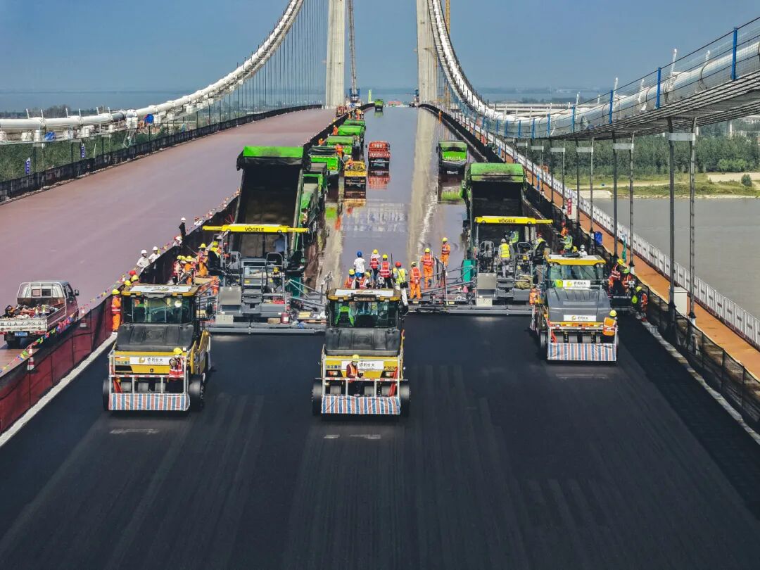 目前,双柳长江大桥主桥钢桥面铺装已全面进入冲刺阶段。项目团队凭借新设备、新工艺与新技术的综合应用,为双柳长江大桥建设提供了有力支撑,其智能建造经验更将为热拌环氧沥青铺装领域提供重要范本。