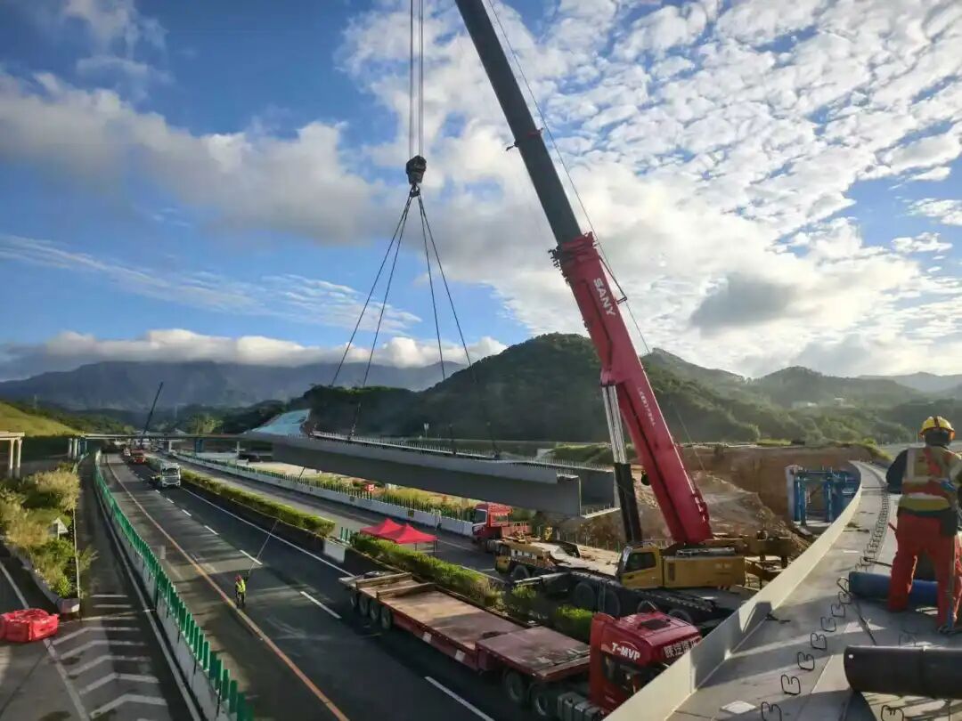 升平枢纽互通位于京港澳高速与汕湛高速交汇处,是粤北地区重要的交通转换枢纽。升平互通B匝道桥、D匝道2号桥第二联上构均采用钢混叠合梁设计,需上跨京港澳高速主线,结构复杂,安装难度高。