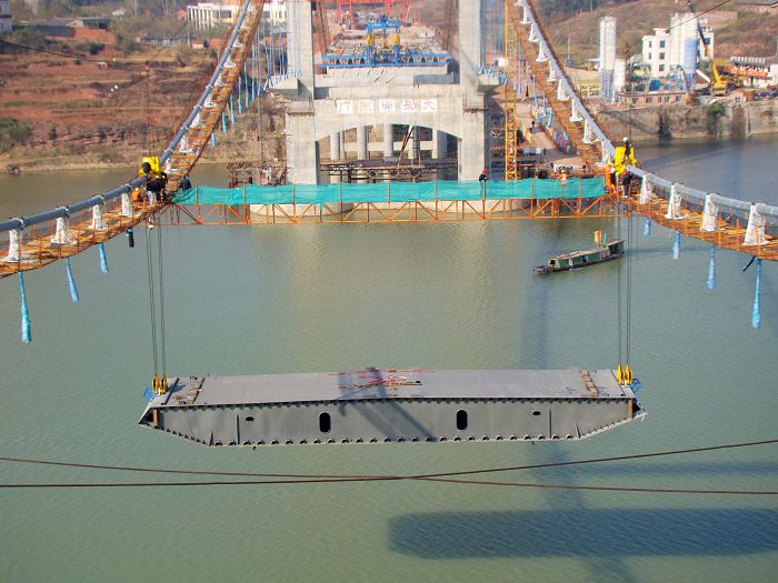 赣江公路大桥主桥采用全封闭钢箱梁结构,桥梁全宽为32.4 米,梁高为3.0 米。钢箱梁以梁段为单元,采用全焊接结构。大桥于8月30日开始主桥上部构造施工,在完成了猫道架设、主缆架设、索夹及吊索安装后,进入了钢箱梁的吊装施工。整个钢箱梁吊装工期约1个月,计划于2010年1月下旬完成。