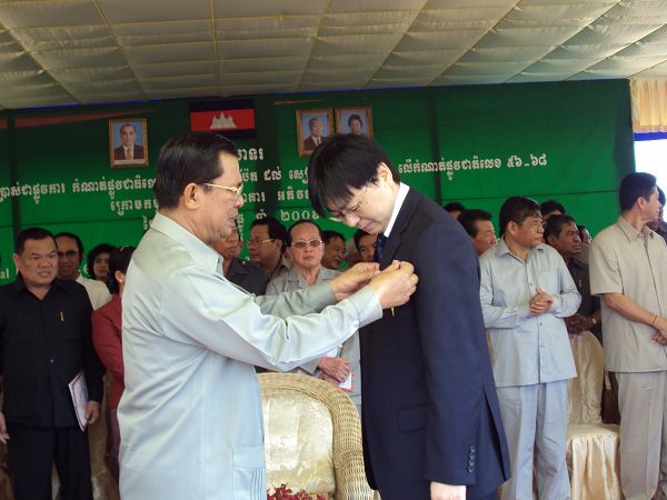 洪森总理在项目竣工典礼上为卓文泽颁发勋章