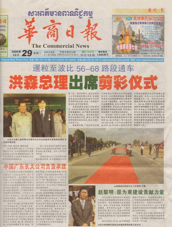 洪森总理在致辞中高度评价了公司承建的56-68号国道道路改(扩)建项目。对公司在十分恶劣的条件下仍坚持不懈、克服重重困难加快施工进度,最终提前3个多月完工所作出的努力表达了由衷的感谢。对项目部员工在施工过程当中表现出来的勤劳品质和专业素养也推崇有加。在竣工典礼上,洪森总理向卓文泽同志颁发了柬埔寨政府授予公司的奖章和奖状。当地主要中文报纸《华商日报》及其他柬文报纸和媒体也对此次典礼进行了全程跟踪报道。